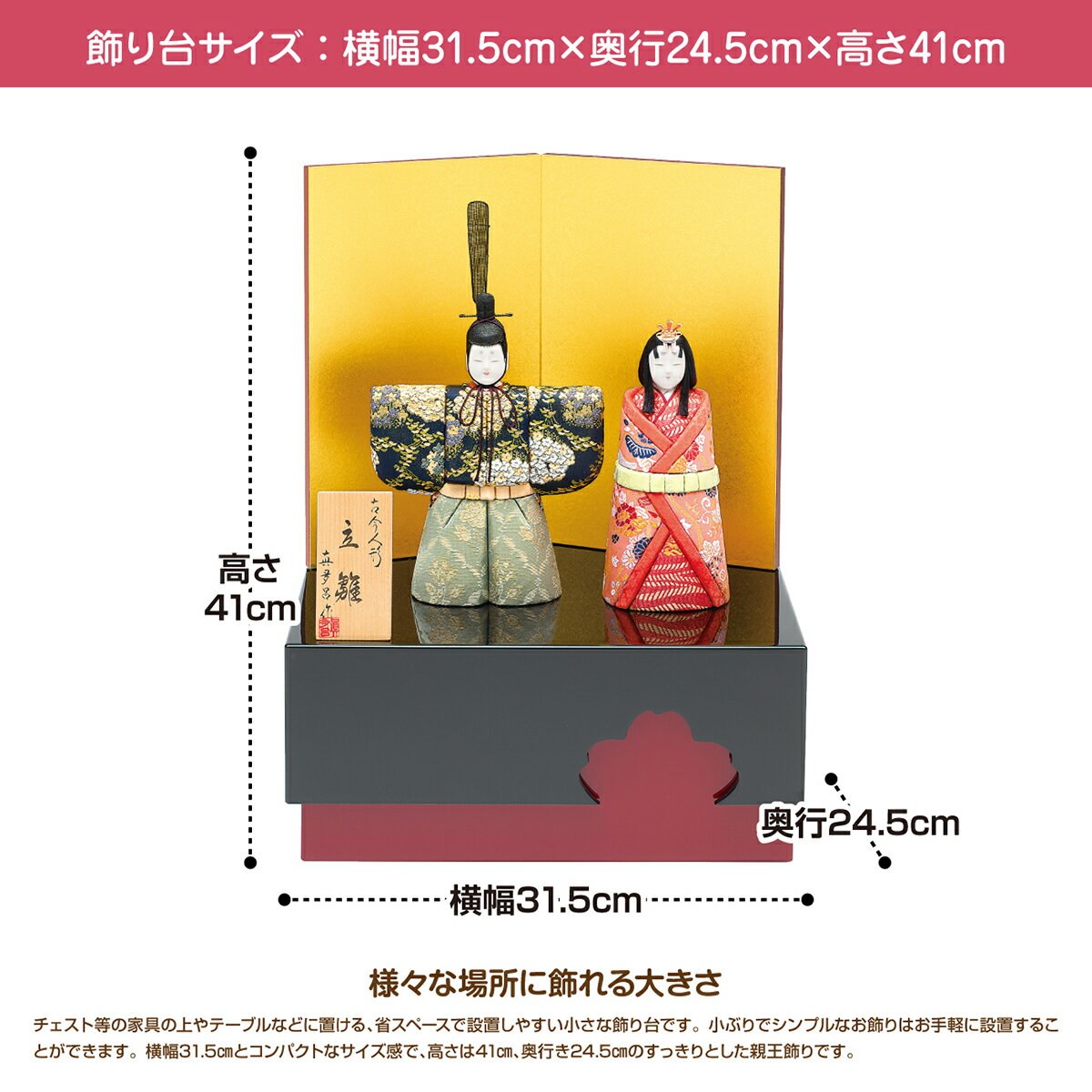 台屏風サイズ 横幅31.5cm×奥行24.5cm×高さ41cm 男雛サイズ 横幅15.5cm×奥行7.5cm×高さ28cm 女雛サイズ 横幅8.5cm×奥行7.5cm×高さ19cm 注意事項 ※必ずお読みください ■免責事項 ※お品に使われている素材等は予告なく変更となる場合がございます。