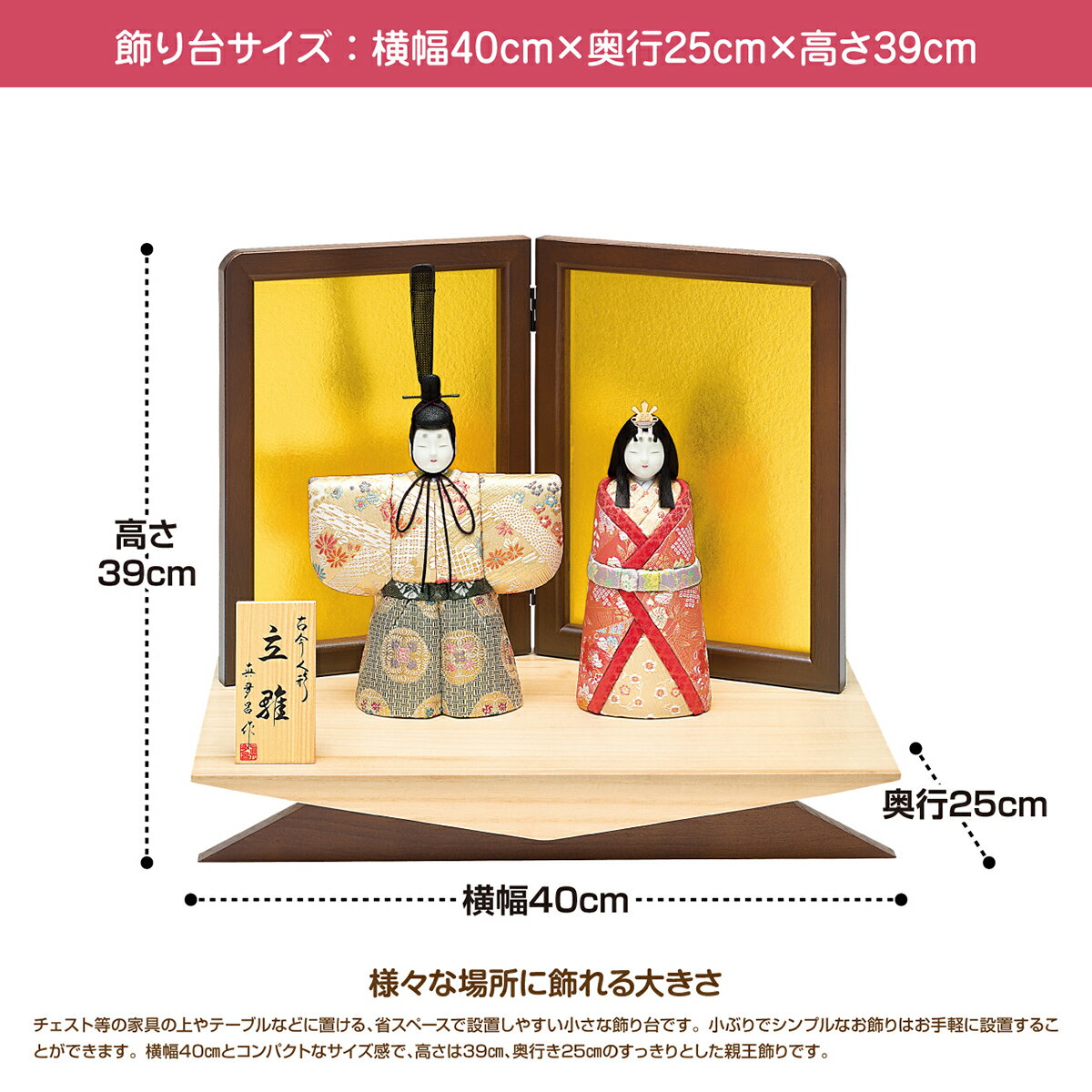 台屏風サイズ 横幅40cm×奥行25cm×高さ39cm 男雛サイズ 横幅15.5cm×奥行7.5cm×高さ28cm 女雛サイズ 横幅8.5cm×奥行7.5cm×高さ19cm 注意事項 ※必ずお読みください ■免責事項 ※お品に使われている素材等は予告なく変更となる場合がございます。