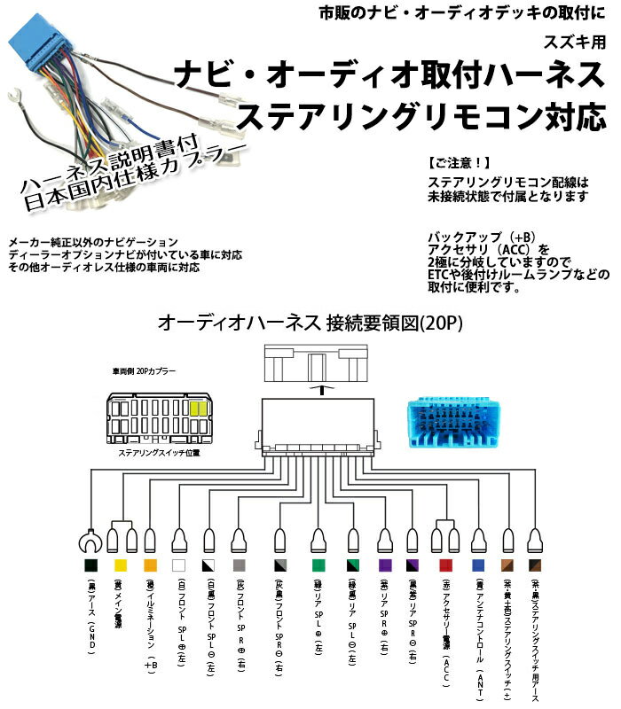 スズキ ステアリングリモコン対応 オーディオハーネス 20ピン ハスラー H26/1 〜 配線 配電図付 ナビ取付 載せ替え 市販社外ナビ取付
